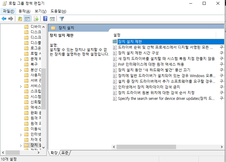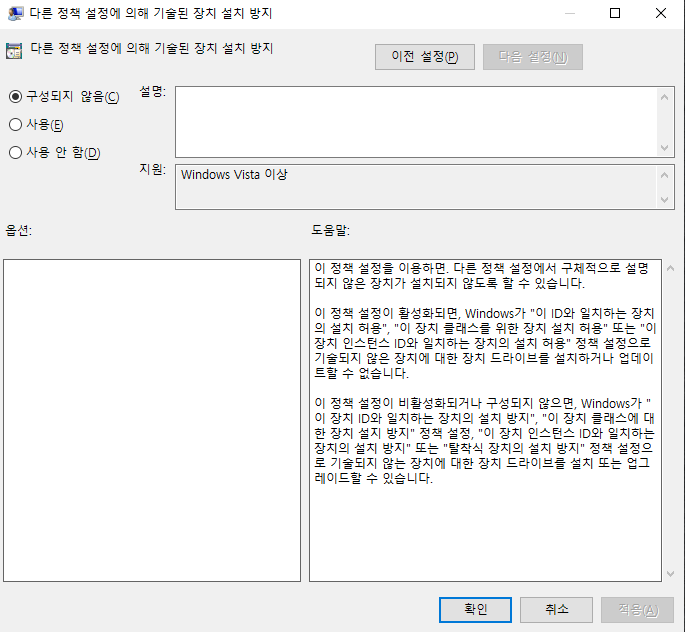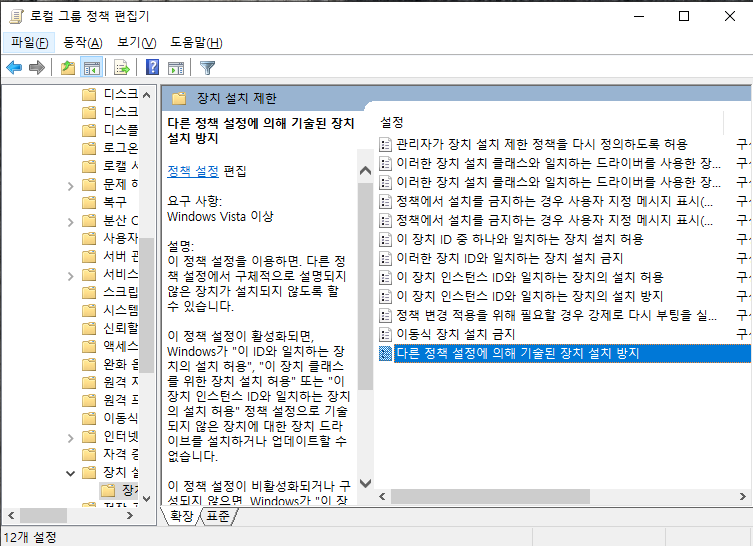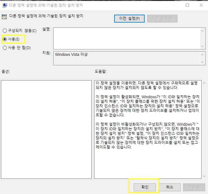 5. [다른 정책 설정에 의해 기술된 장치 설치 방지] 더블클릭