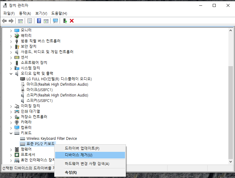 7. 다시 [장치 관리자]로 돌아와서 키보드 - [표준 PS/2 키보드] 우클릭 - 디바이스 제거 클릭