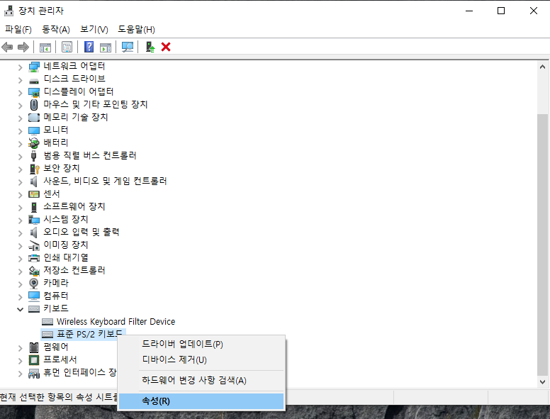 2. 키보드-[표준 PS/2 키보드] 우클릭 - [속성] 클릭