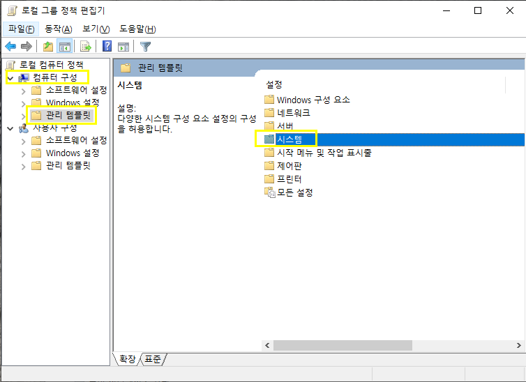 2. 컴퓨터 구성 - [관리 템플릿] - [시스템] 더블 클릭