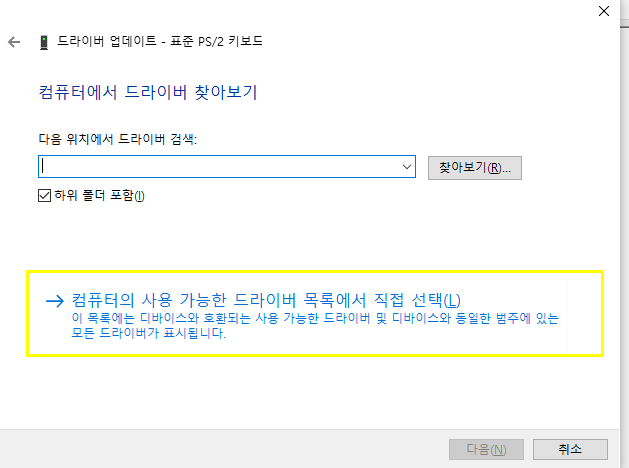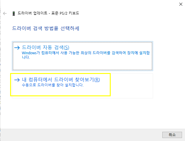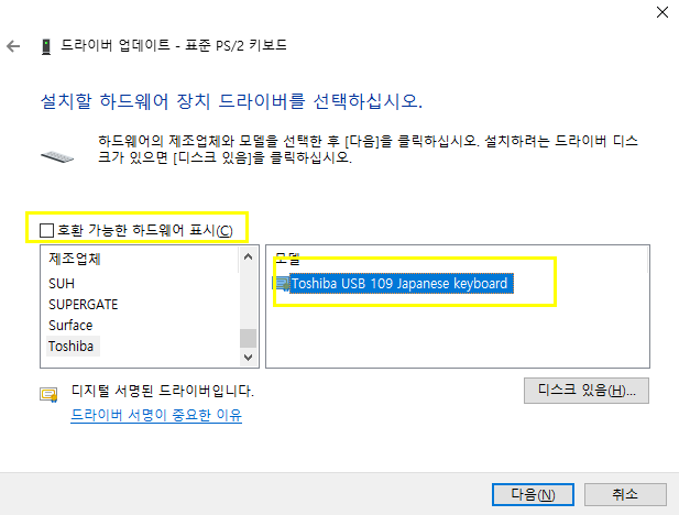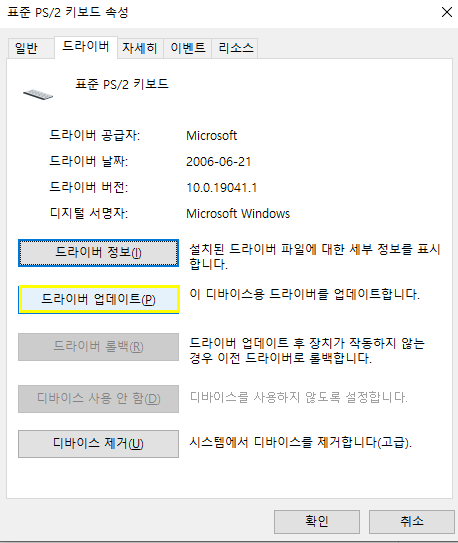 * 다시 노트북 키보드를 사용하고 싶다면, 1~6의 과정을 다시 거친 후, 원래 키보드인 [표준 PS/2 키보드]로 다시 업데이트하면 된다