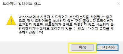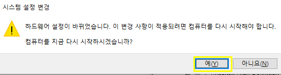 8. 경고창이 뜨는데, [예]를 선택하고 다시 시작하면 된다.