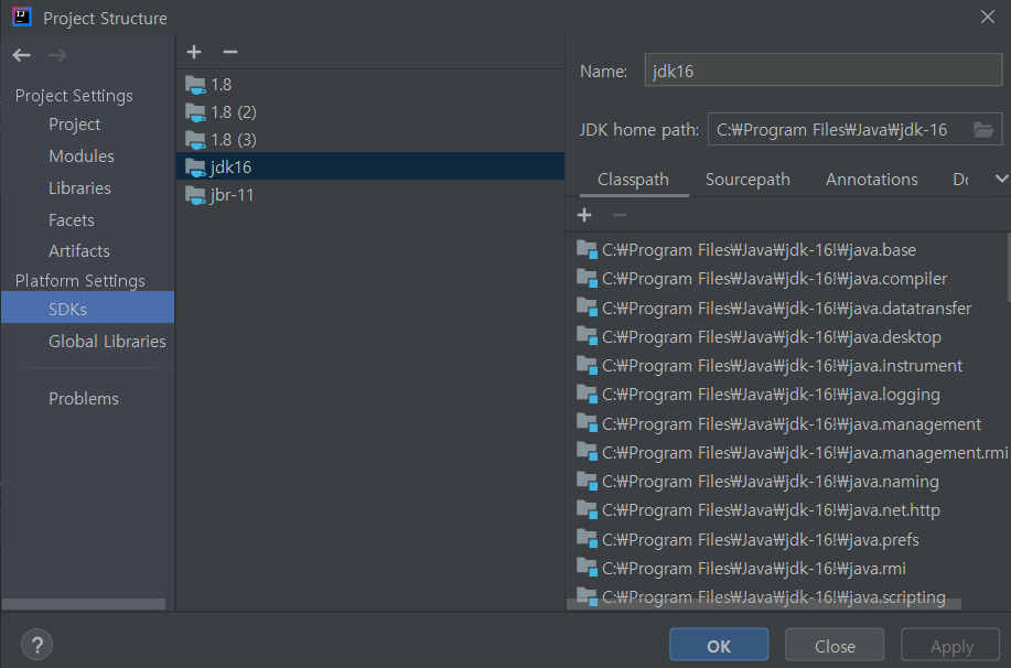 2. Platform Settings에서 원하는 java 버전으로 바꾸고 이름도 설정