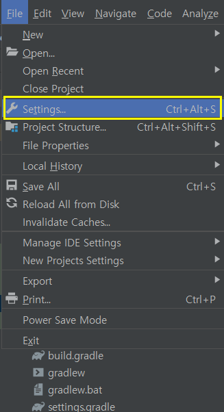 1. File - Settings (Ctrl + Alt + S) 클릭