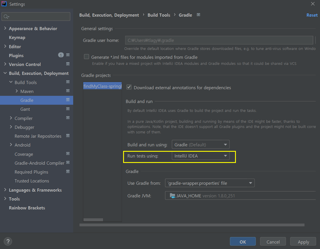 2. Build,Execution, Deployment - Build Tools - Gradle - Run tests using : IntelliJ IDEA로 변경
