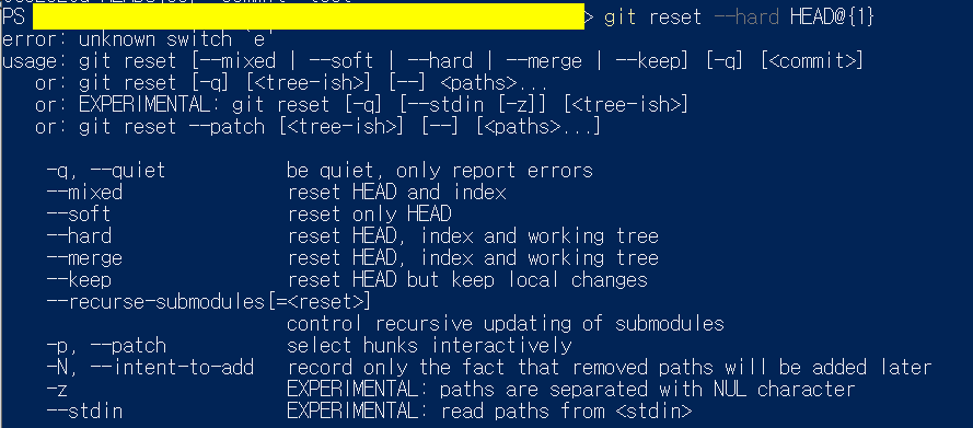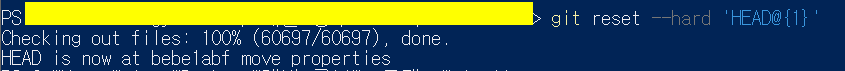 확인 후 git reset --hard HEAD@{1} 를 입력했지만