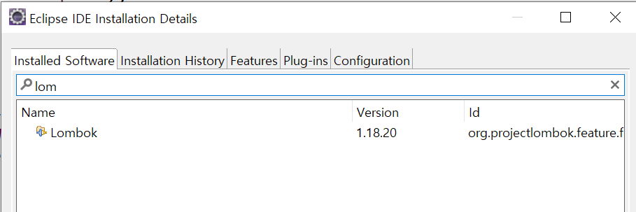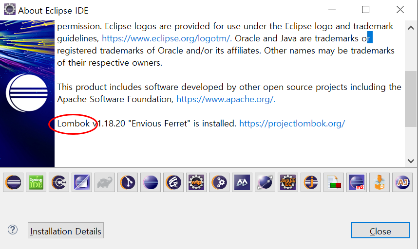 lombok이 설치되면 이렇게 Help-About Eclipse IDE를 들어가봤을때 끝에 Lombok이 뜬다