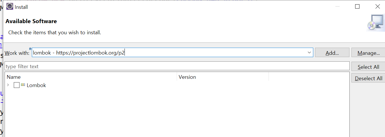 Help-Install New Software 에서 lombok을 다운받는다