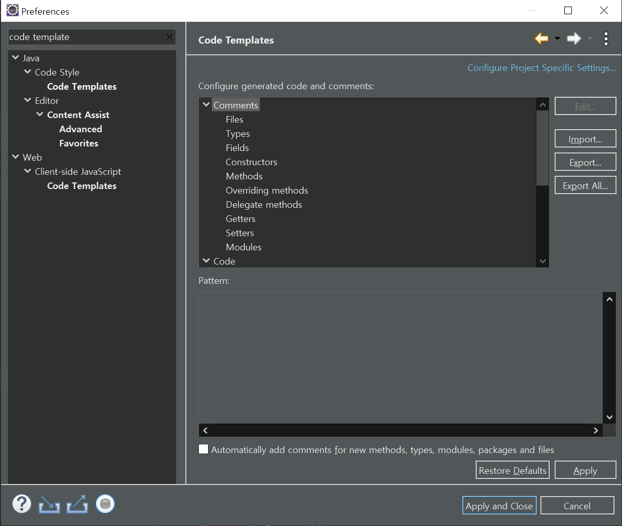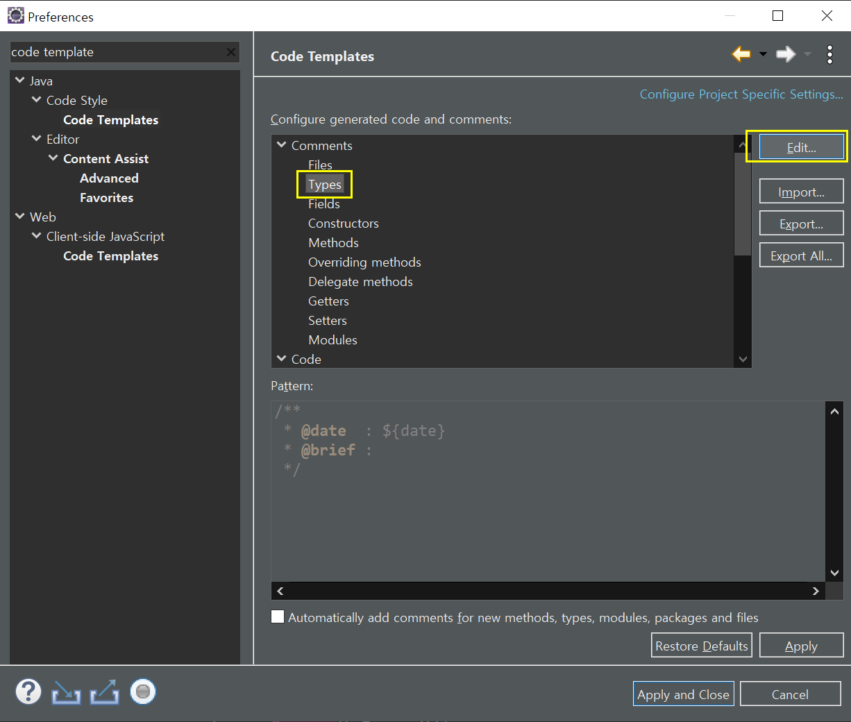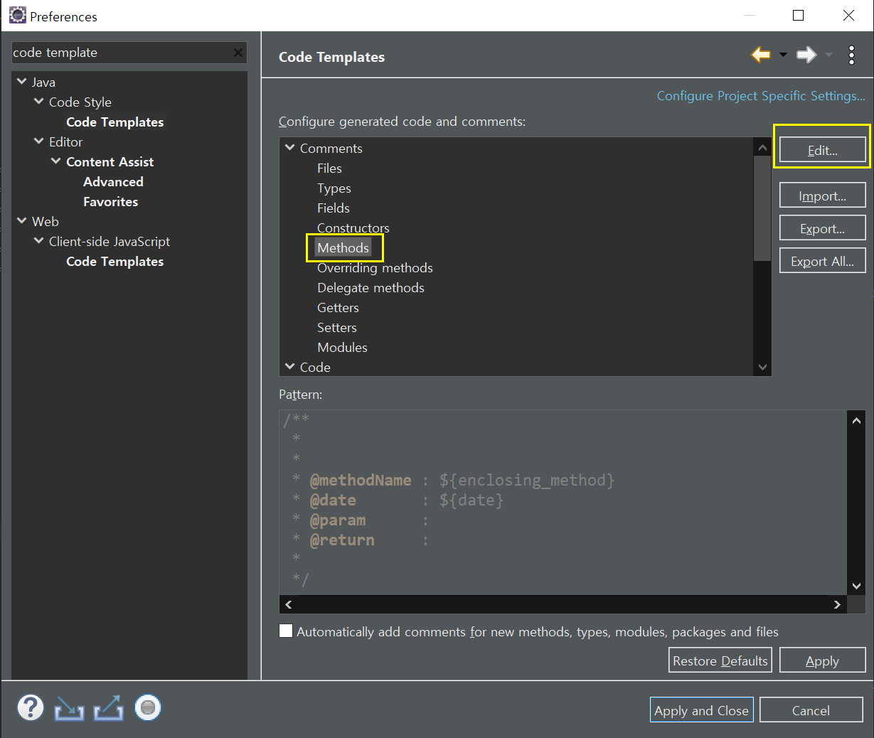 주석 템플릿을 설정하면 Shift+Alt+J 를 눌렀을 때 주석 템플릿을 한번에 불러올 수 있다.