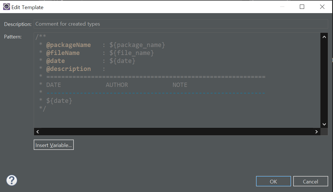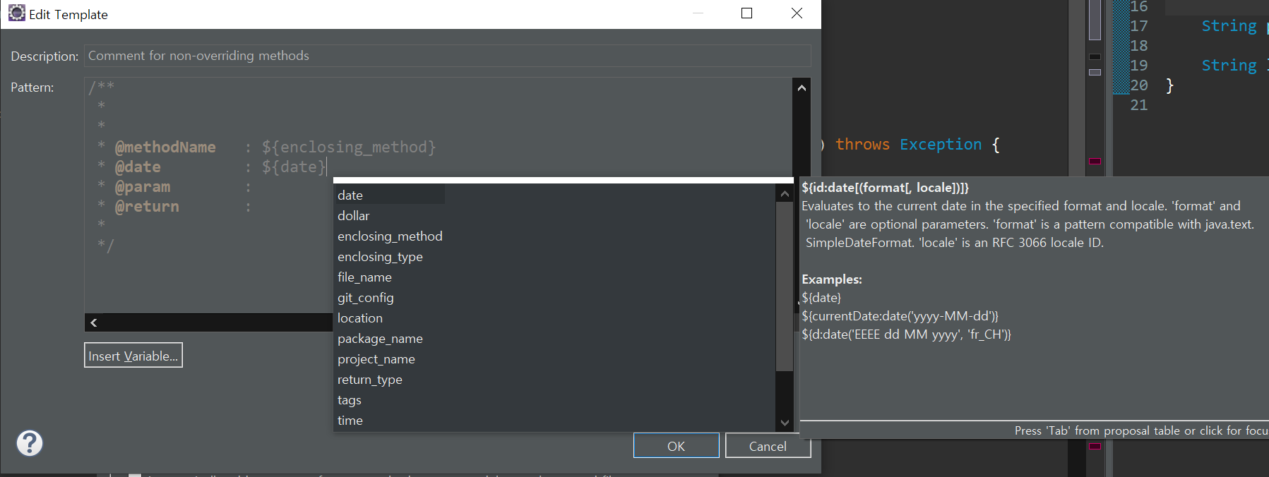 Insert Variable... 을 누르면 템플릿 기본 변수 선택할 수 있다.