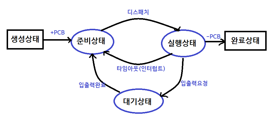 - 대기 상태(blocking status) : 실행 상태에 있는 프로세스가 입출력을 요청하면 입출력을 완료할때까지는 기다리는 상태. 입출력이 완료되면 준비상태로 돌아간다.