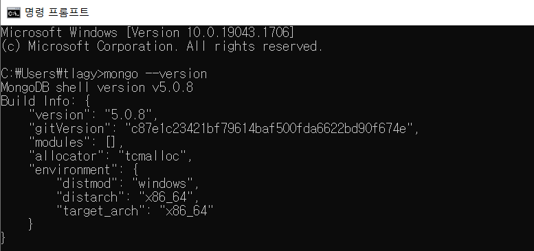 5. cmd(명령 프롬포트)를 열어 'mongo --version'으로 몽고디비의 버전을 확인 할 수 있다