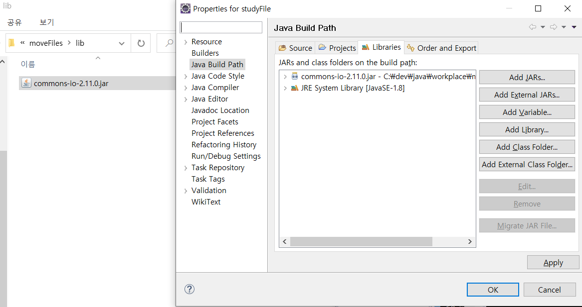 Apache Common IO라이브러리가 없으므로 lib폴더를 생성 후 다운받은 라이브러리를 빌드 패스에 추가시켰다.