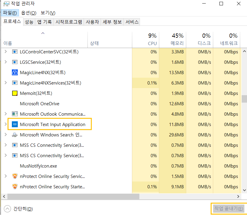 거기서 Microsoft Text Input Application을 찾아 '작업 끝내기' 를 눌러 제거하면 된다.